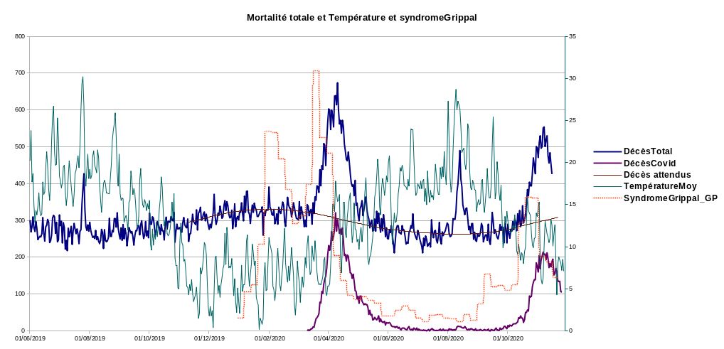 3. Seul graphique avec des chiffres bruts, il permet de visualiser rapidement l’importance d’un problème en santé publique. Mortalité générale, comparée à la mortalité attribuée au covid. Malheureusement les données de mortalité générale viennent avec 15 jours de retard environ.