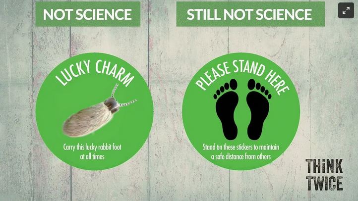 Droite: "encore de la non-science. Restez ici. Restez debout sur ces auto-collnts afin de maintenir la distance sécure entre clients".