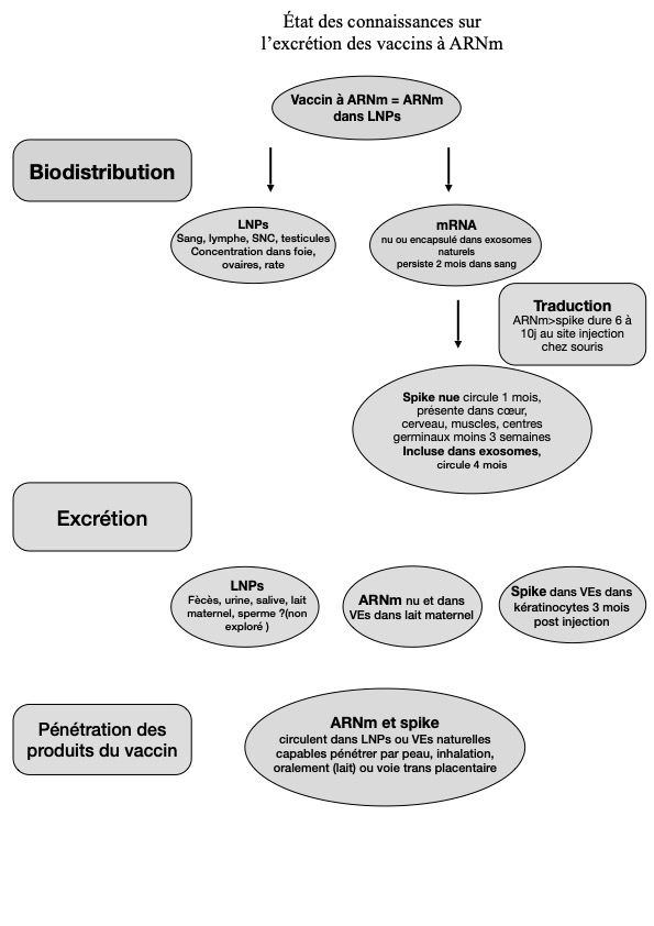 Toutes ces études montrent que les VEs porteuses d'ARNm et de spike pourraient donc être excrétées par différents fluides corporels et pourraient pénétrer par voie transcutanée ou par inhalation chez des individus non vaccinés (ainsi que par le lait maternel chez les nourrissons et par passage transplacentaire chez les fœtus et pourquoi pas par le sperme). L'ARNm nu pourrait également être excrété et pénétrer.