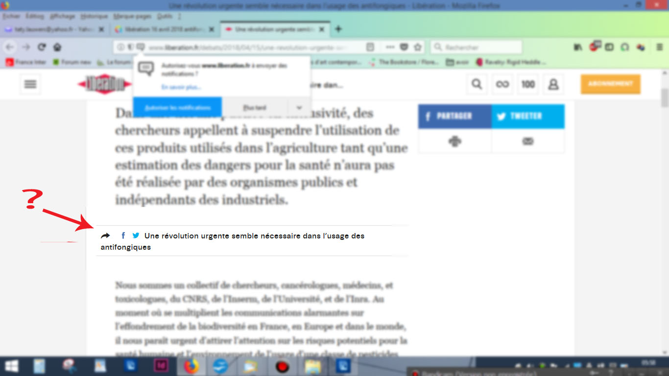 Je voudrais relayer sur ce blog une alerte scientifique aux fongicides, qui me semble drôlement d'actualité. Rendez-vous sur le site de l'émission de France Inter La tête au carré, qui a relaté cette alerte dans son chapitre "la une de la science" du 18 avril 2018. L'auditeur n'a pas le privilège d'une transcription (comme c'est le cas pour les émissions du dr Dupagne, dans la même émission - merci à lui!), format qui est privilégié par certains (qui a le temps d'écouter de longs échanges? alors qu'on lit si vite le contenu d'une conversation), ni même de résumé, ni le nom d'intervenant. Rien pour faciliter la recherche. J'imagine qu'ils s'épargnent ce travail sur le site parce qu'on trouverait ces infos sur leur page FB? Car ils s'y réfèrent sans arrêt: "rendez vous sur notre page facebook". Que font-ils donc des résistants à cette hégémonie? de ceux qui souhaitent rester droits et fiers, qui n'ont pas l'âme d'un gnou? Comment un non-geek pourrait-il relayer cette information cruciale sur son blog, facilement? On comprend que la majorité silencieuse ne se fie plus qu'à ce réseau, vu que les relais sont prémâchés.