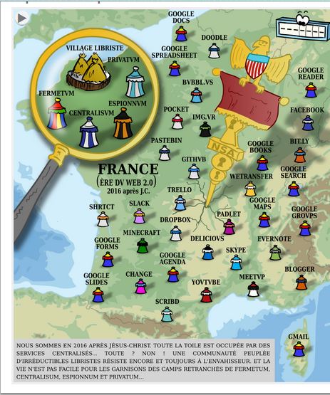 Vous vous sentez piégés par ces grands services gratuits? Une petite interaction ludique avec le village libre selon degooglisons-internet.org, ces irréductibles qui résistent encore et toujours à l'envahisseur. Cliquez sur l'image pour accéder à leur carte et découvrir les solutions alternatives: