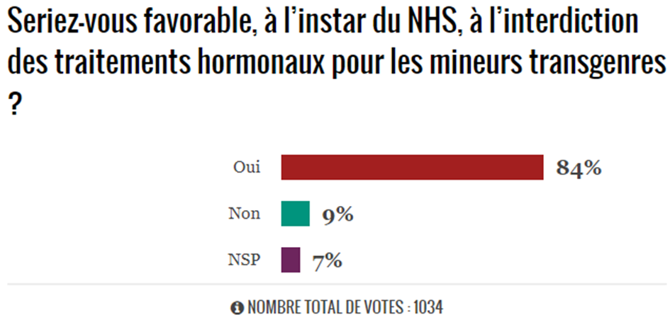 Selon notre sondage, 84 % de nos lecteurs sont favorables à un moratoire sur l'administration de traitements hormonaux pour les mineurs transgenres. La question de la prise en charge et de l'intégration des personnes transgenres dans notre société est devenue ces dernières années une question majeure du débat public, recoupant des interrogations politiques, juridiques, philosophiques et bien sur médicales et éthiques. Les avis sont souvent passionnés, rendant la possibilité d'un débat apaisé malheureusement illusoire, d'autant plus quand la question concerne les enfants et les adolescents.