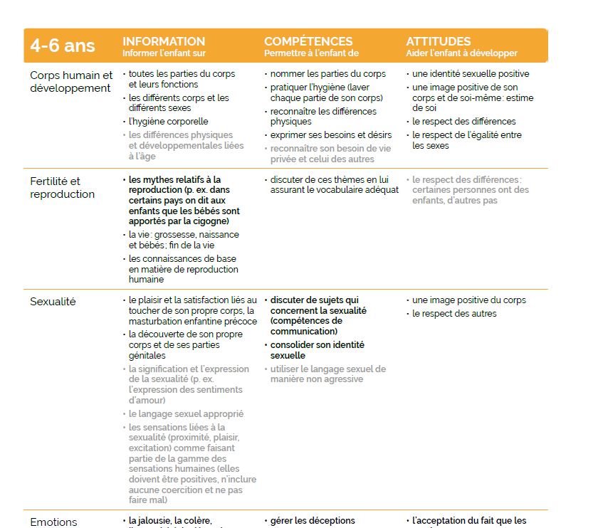 En image, un extrait des normes pour l'éducation sexuelle dès 4 ans, OMS.