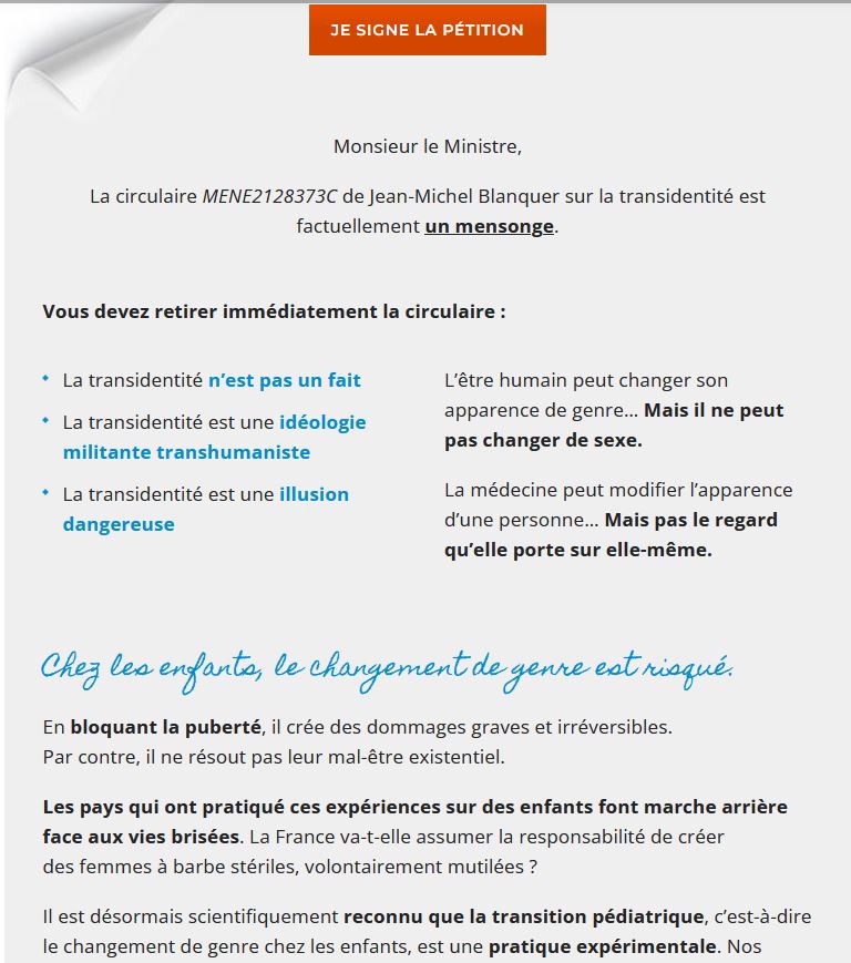 SOS Education (une association à but non lucratif, reconnue d’intérêt général, qui rassemble tous les citoyens qui souhaitent obtenir une amélioration du système éducatif français) a lancé une pétition pour contrer une circulaire Education Nationale (FR) datant de 2021, entretenant la confusion des genres au sein de l'enseignement.