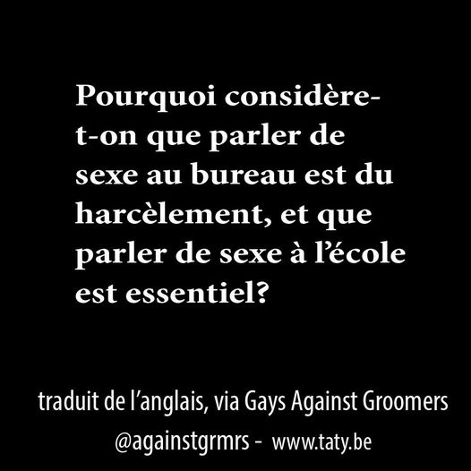 19/8/2023 traduit de l’anglais, via Gays Against Groomers @againstgrmrs : Pourquoi considère-t-on que parler de sexe au bureau est du harcèlement, et que parler de sexe à l’école est essentiel?