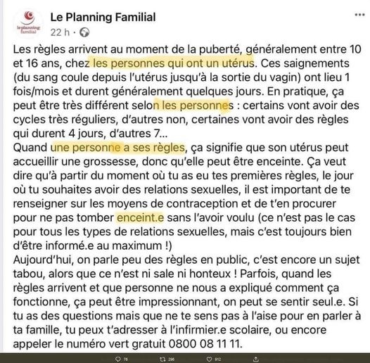 Mais dans nombre de cas de figure, nous sommes dans une prise de pouvoir, un déni de la femme, si pas une mysoginie flagrante. Comme ici où le planning familial ne cite pas le mot "femme" dans tout son texte parlant des règles. Hilarant si ce n'était glaçant de bêtise.