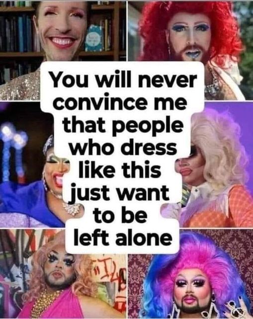 J'illustre avec une image critique: "vous ne me persuaderez jamais que des gens qui se montrent ainsi veulent qu'on les laisse tranquilles." Contexte: parmi les innombrables refrains des trans (les jeunes piégés et les gourous sur la photo) : "on nous critique, on nous en veut, on nous fait des remarques..." En gros, nous sommes victimes, vous êtes tous méchants, laissez-nous en paix.