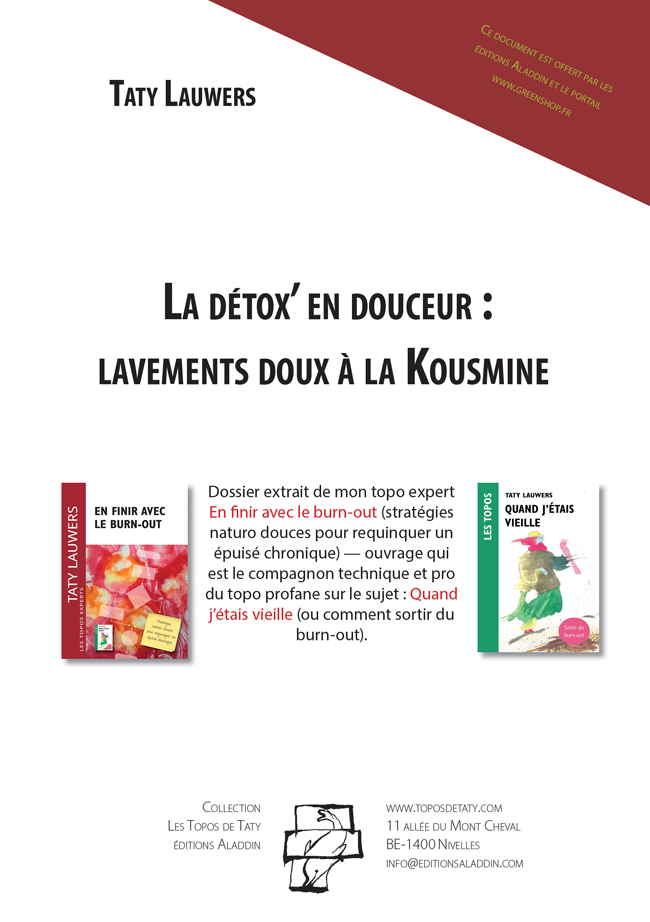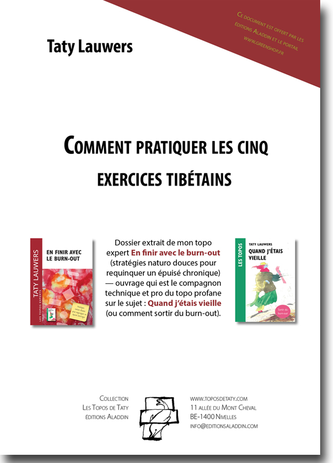 Téléchargez ci-dessous les dossiers cadeaux de cette série. Ce sont des extraits de mon topo expert "En finir avec le burn-out" (stratégies naturo douces pour requinquer un épuisé chronique). Que je pourrais pitcher ainsi: "Revenir aux techniques simples des anciens pour sortir du burn-out : se fier au repos organique profond pour stimuler les forces d'auto-guérison" .
