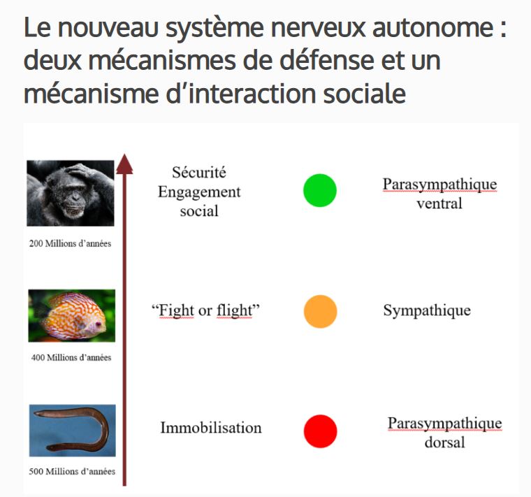 J’ai repris une image de ce site résumant le concept de Porges - un de ses concepts, qui hélas ! n’est pas validé par les experts du domaine du SNA. Le système vagal dorsal n’a pas d’impact physiologique tel que démontré par des études, c’est une hypothèse de travail de Porges. Comme toute hypothèse, ça passe ou ça casse : il faut l’expérimenter.