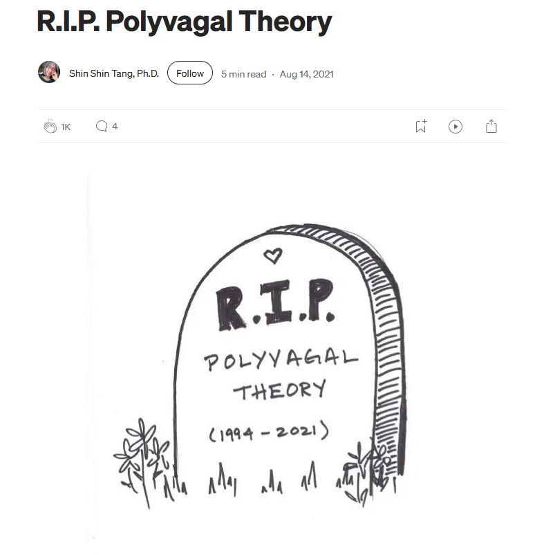 Un article chez Shin Shin Tang, docteur en psychologie spécialisée en traumas, qui écrit avec humour : « Je me sens un peu comme le Grinch qui a volé Noël lorsque je dis : nous devons arrêter d'enseigner la théorie polyvagale à nos clients et étudiants. Parfois, une théorie ne fonctionne pas même si elle semble géniale» dans « R.I.P. Polyvagal Theory » sur https://medium.com/@drshinshin/r-i-p-polyvagal-theory-897f935de675