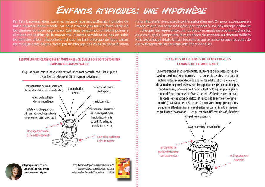 Par Taty Lauwers. Nous sommes inégaux face aux polluants invisibles de notre nouveau beau monde, car nous n’avons pas tous la force vitale de les éliminer de notre organisme. Certaines personnes semblent peiner à éliminer ces résidus de la modernité, d’autres semblent ne pas en subir les néfastes effets. L’hypothèse est que l’enfant atypique de type canari est marqué à des degrés divers par un blocage des voies de détoxification naturelles et n’arrive pas à détoxifier naturellement. On pourra comparer en image ce que son corps doit gérer par rapport à une physiologie ordinaire — celle que l’on représente dans les beaux manuels de biochimie. Dans les dessins ci-après, j’emprunte la métaphore du tonneau au docteur William Rea, toxicologue (Etats-Unis). Illustrons ce qui se passe lorsque les voies de détoxification de l’organisme sont fonctionnelles.