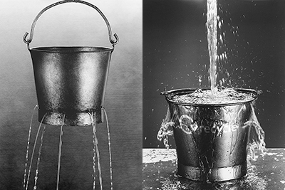 Mon hypothèse: un canari de naissance est un déficient du processing. L'input fonctionne, il mange, il mastique. L'output fonctionne puisqu'il excrète des résidus (et encore! c'est pas toujours gagné). Mais c'est le traitement (le processing) de la nourriture dans le corps qui fait défaut, comme s'il ne connaissait pas la grammaire. On dirait que les aliments entrent et sortent sans subir de traitement utile et constructif. Ou qu'ils fuient par je ne sais quel orifice, comme dans le seau représenté ci-dessous.