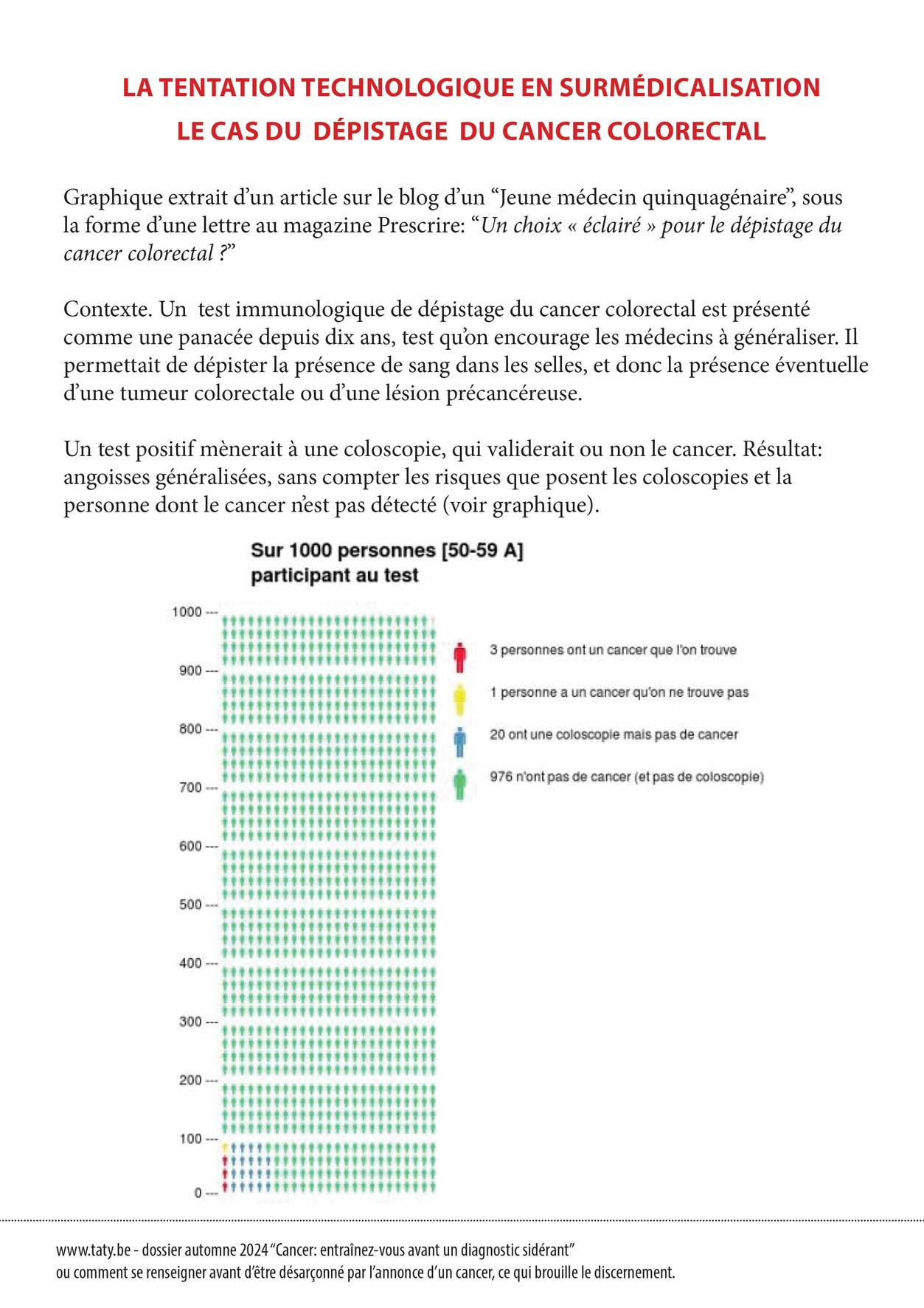 Un test immunologique de dépistage du cancer colorectal est présenté comme une autre panacée depuis dix ans. Une lettre d'invitation serait envoyée à tous les Français de 50 à 74 ans (bonne nouvelle: moins de 30% donnent suite, on a encore du bon sens en France). Ce test permettait de dépister la présence de sang dans les selles, et donc la présence éventuelle d’une tumeur colorectale ou d’une lésion précancéreuse. Un test positif mènerait à une coloscopie, qui validerait ou non le cancer.