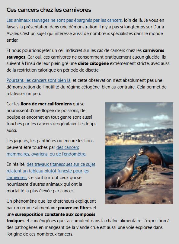 Si l'on regarde l'extrait en image, provenant de chez Jérémy Anso, on peut comprendre que la faune carnivore, terrestre ou marine, soit victime de cancers alors qu'ils ne consomment aucun glucide (on pourrait dire qu'ils "mangent céto" s'ils en avaient l'intention), qu'ils vivent au grand air, qu'ils font beaucoup d'exercice, qu'ils bénéficient des lumières naturelles (toutes les clefs d'une hygiène de vie "anticancer").