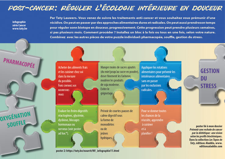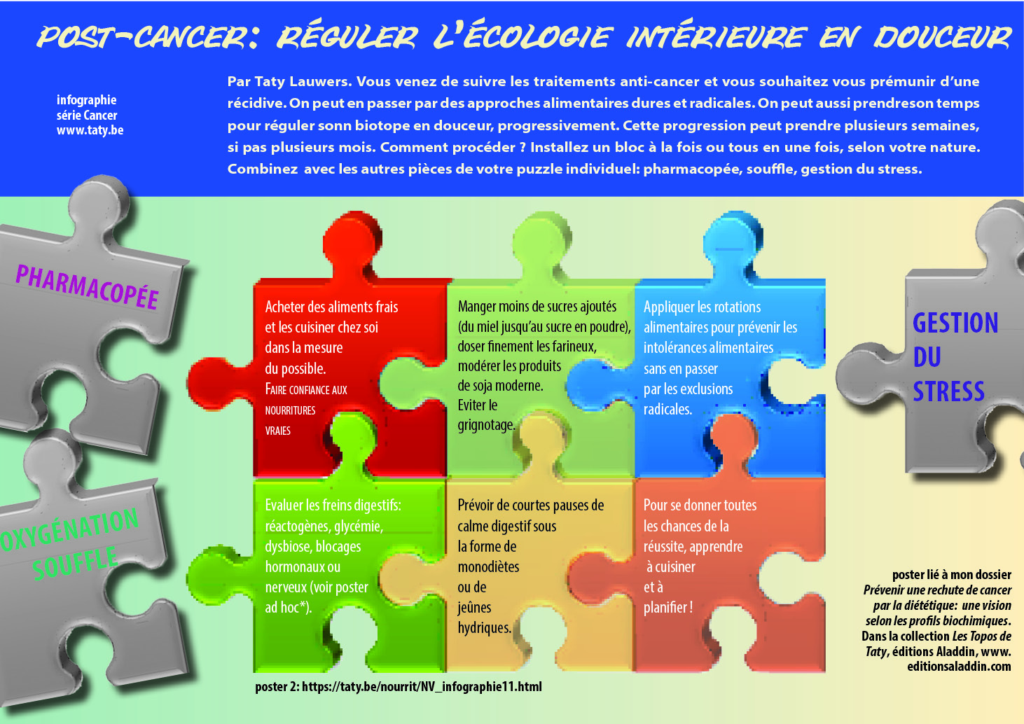 une vision selon les profils biochimiques. Introduction Si j'en crois mes 30 ans d'exploration du monde de la nutri, il n'existe pas une seule voie pour une pathologie particulière (l'après-cancer, en l'occurrence). En revanche, si l'on trouve son mode alimentaire optimal, ce dernier sera un adjuvant formidable dans la remise sur pied de tout désordre organique, depuis le rhume jusqu'au cancer en passant par une maladie auto-immune. L'avantage de cette approche est qu'on redonne ainsi à chaque mangeur la liberté de manger et le respect de soi. Et qu'on met tout le monde d'accord: c'en est fini des vaines polémiques entre vegans et viandards, puisque tous ont raison, mais pas pour tous les mangeurs ni dans tous les cas de figure.