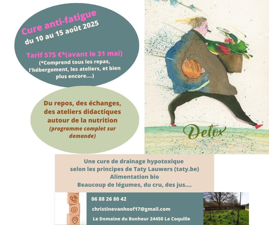 Printemps: le temps de la cure. Que dites-vous d'une petite "cure antifatigue"? En prévention réelle d'un cancer, j'invite à pratiquer une à deux fois l'an une diète comme la Cure Antifatigue, cette diète de drainage hypotoxique (alias détox' pour détoxification). Considérons-la comme anti-cancérogenèse.
