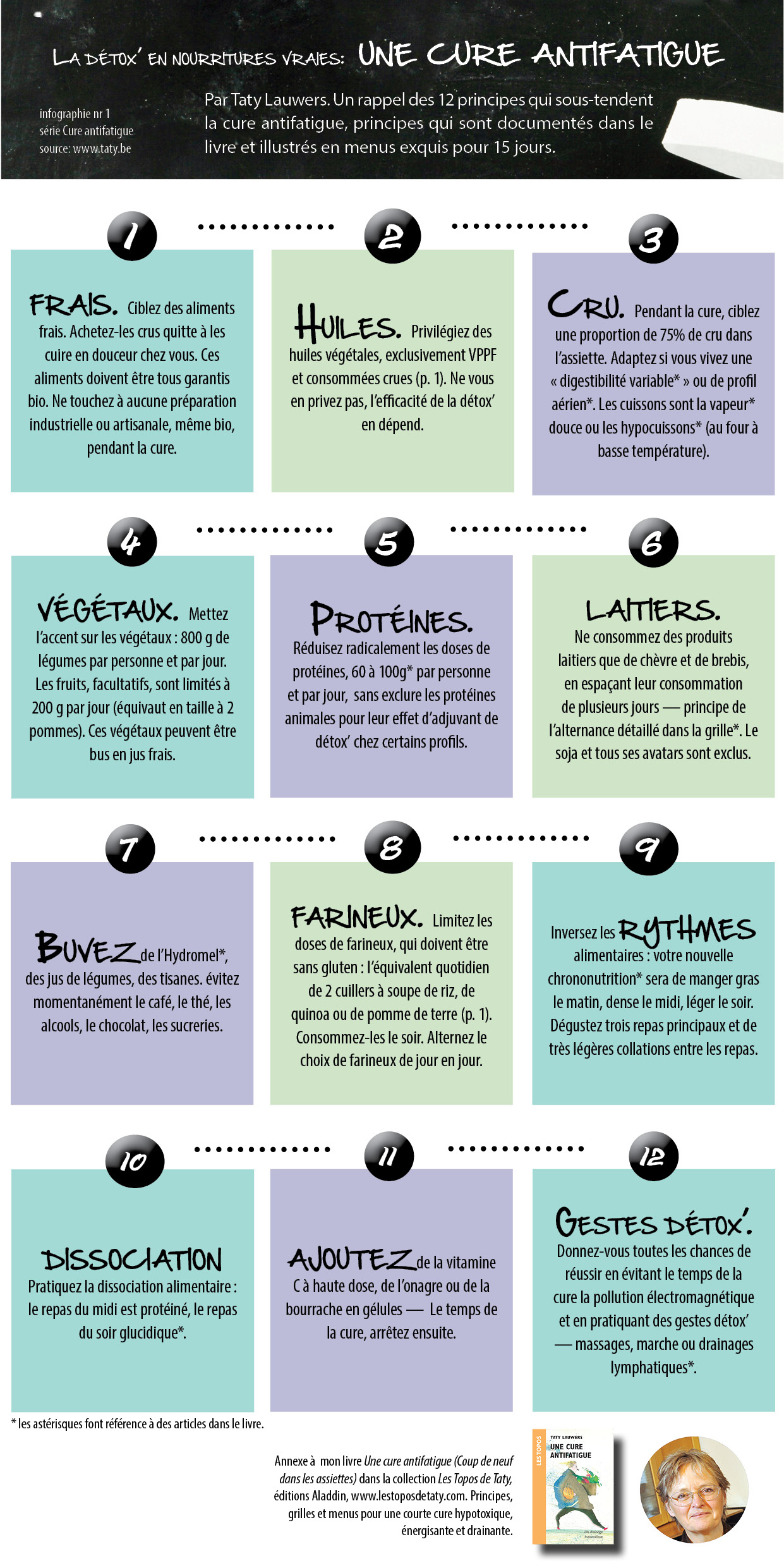 Pratiquer une cure temporaire un des moyens pour faire ressentir à quel point l'assiette peut être thérapeutique. La cure antifatigue est un programme hypotoxique de 15 jours très structuré et extrême. Beaucoup de légumes, frais, bio, crus. Des huiles végétales VPPF. Peu de protéines. Aucun additif. Quasi tous les aliments sont bio. On les cuisine soi-même. Toutes les graisses sont crues, sans exception."