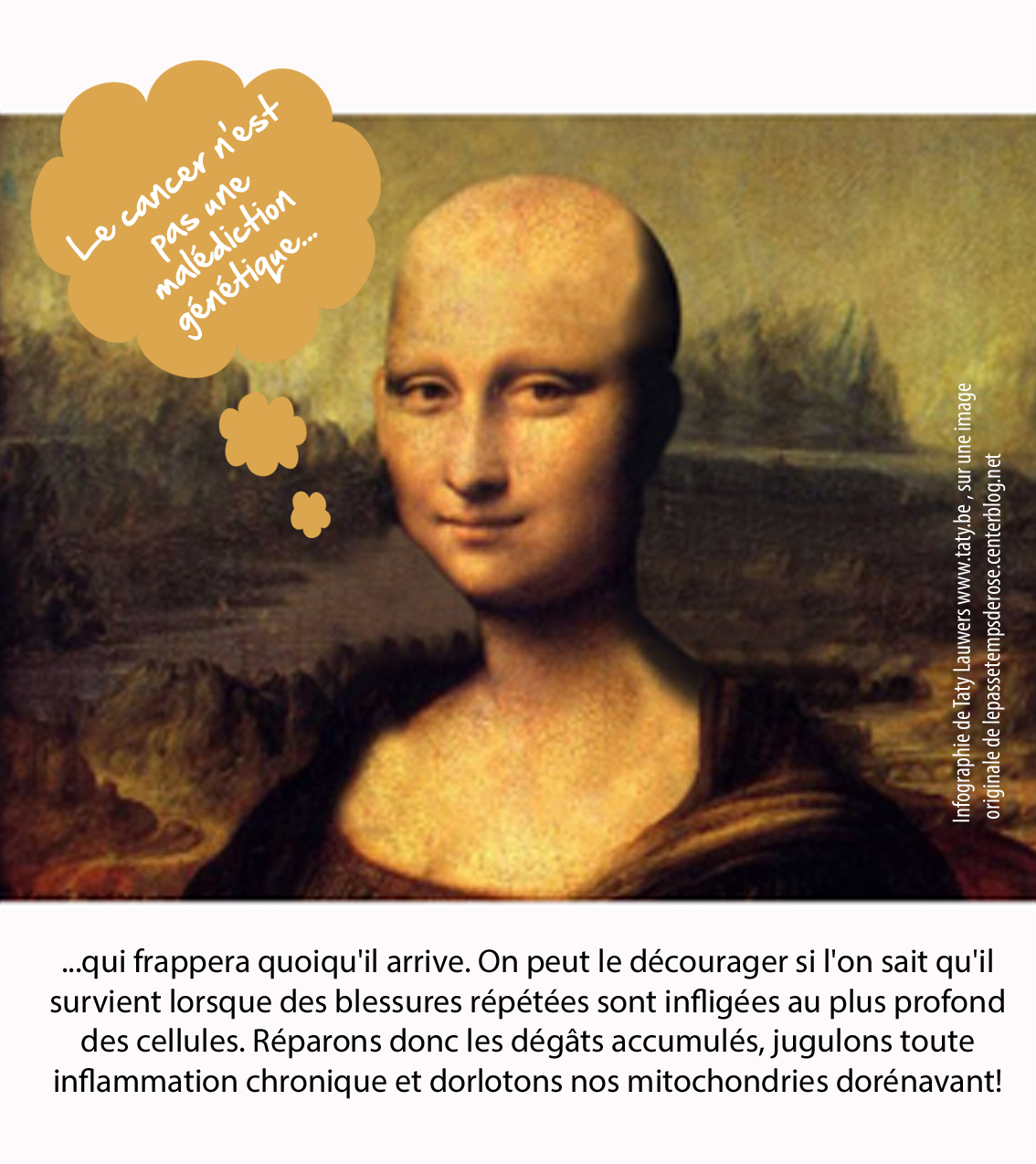 La croyance qui sous-tend mon dossier "cancer" cet automne 2017: le cancer n'est pas une malédiction génétique qui frappera quoiqu'il arrive. On peut le décourager si l'on sait qu'il survient lorsque des blessures répétées sont infligées au plus profond des cellules. Réparons donc les dégâts accumulés, jugulons toute inflammation chronique et dorlotons nos mitochondries dorénavant!