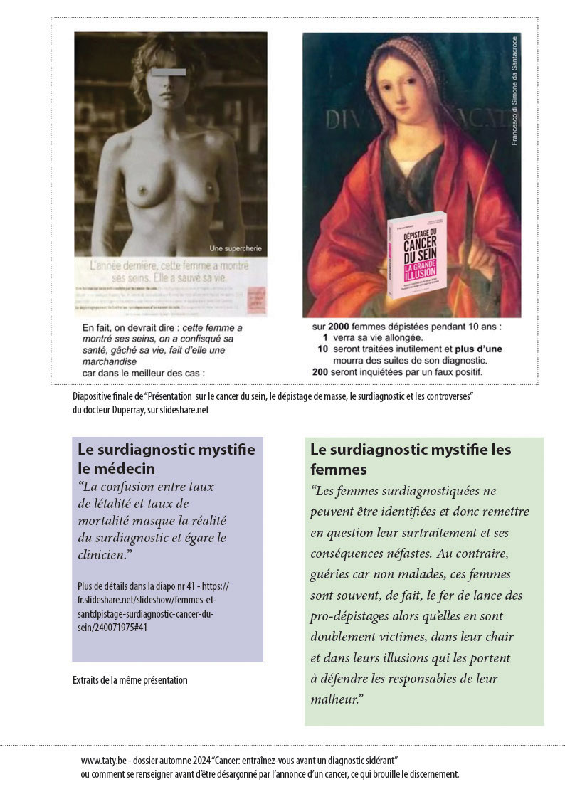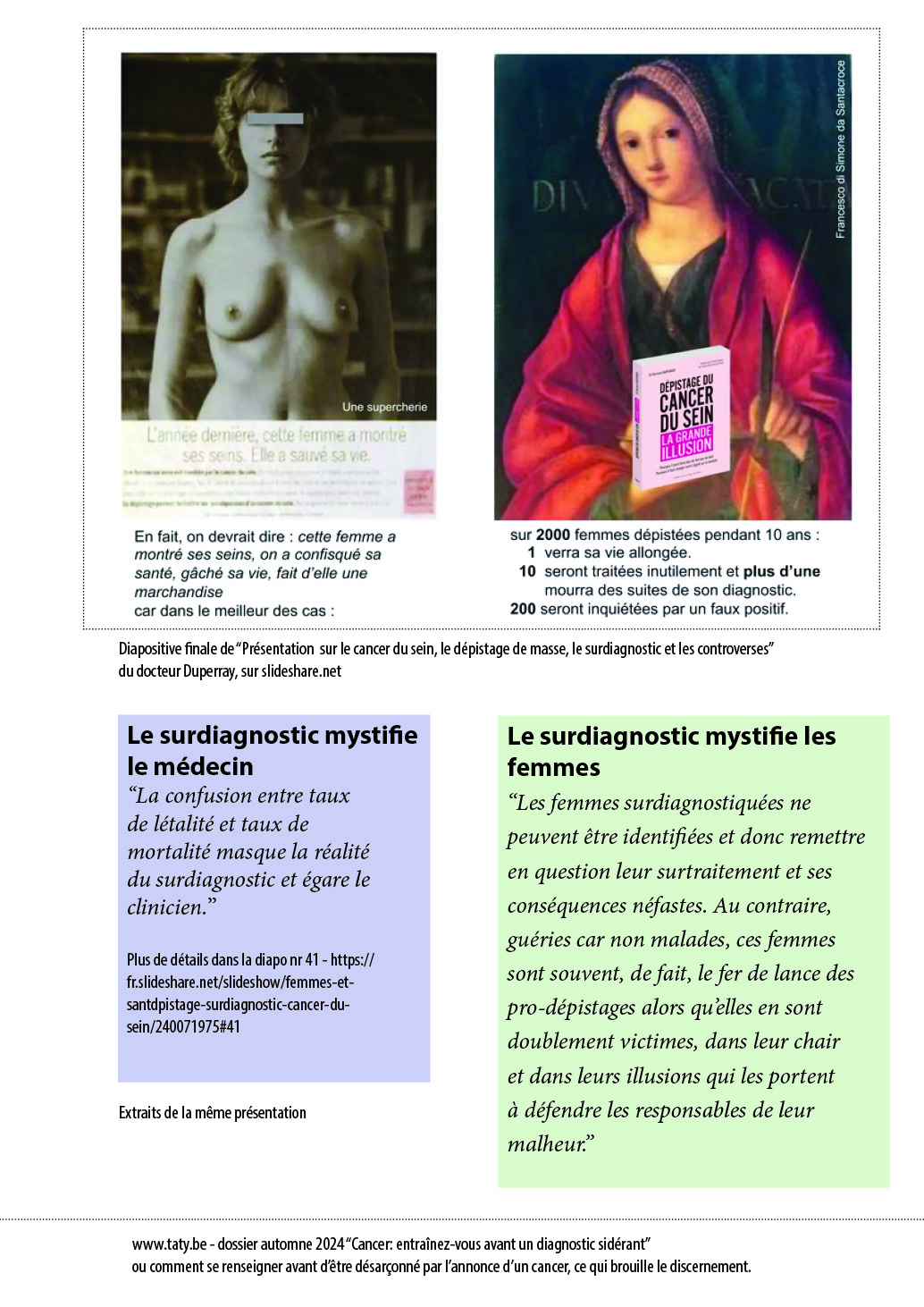 26.10.24 Le livre du docteur Duperray: "Dépistage du cancer du sein, la grande illusion" (Pourquoi le dépistage peut faire plus de mal que de bien et pourquoi il faut changer notre regard sur la maladie) est édité chez Thierry Souccar éditions, 2019. Quelques pistes pour s'informer, en conscience, dont une conférence très instructive du dr Cécile Bour.