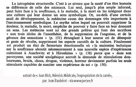 -Le mythe selon lequel la suppression de la douleur, du handicap et le recul indéfini de la mort, sont des objectifs désirables et réalisables grâce au développement sans limites du système médical – mythe qui compromet la capacité autonome des hommes de faire face justement à la douleur, à l’infirmité et à la port en leur donnant un sens (iatrogenèse structurelle).