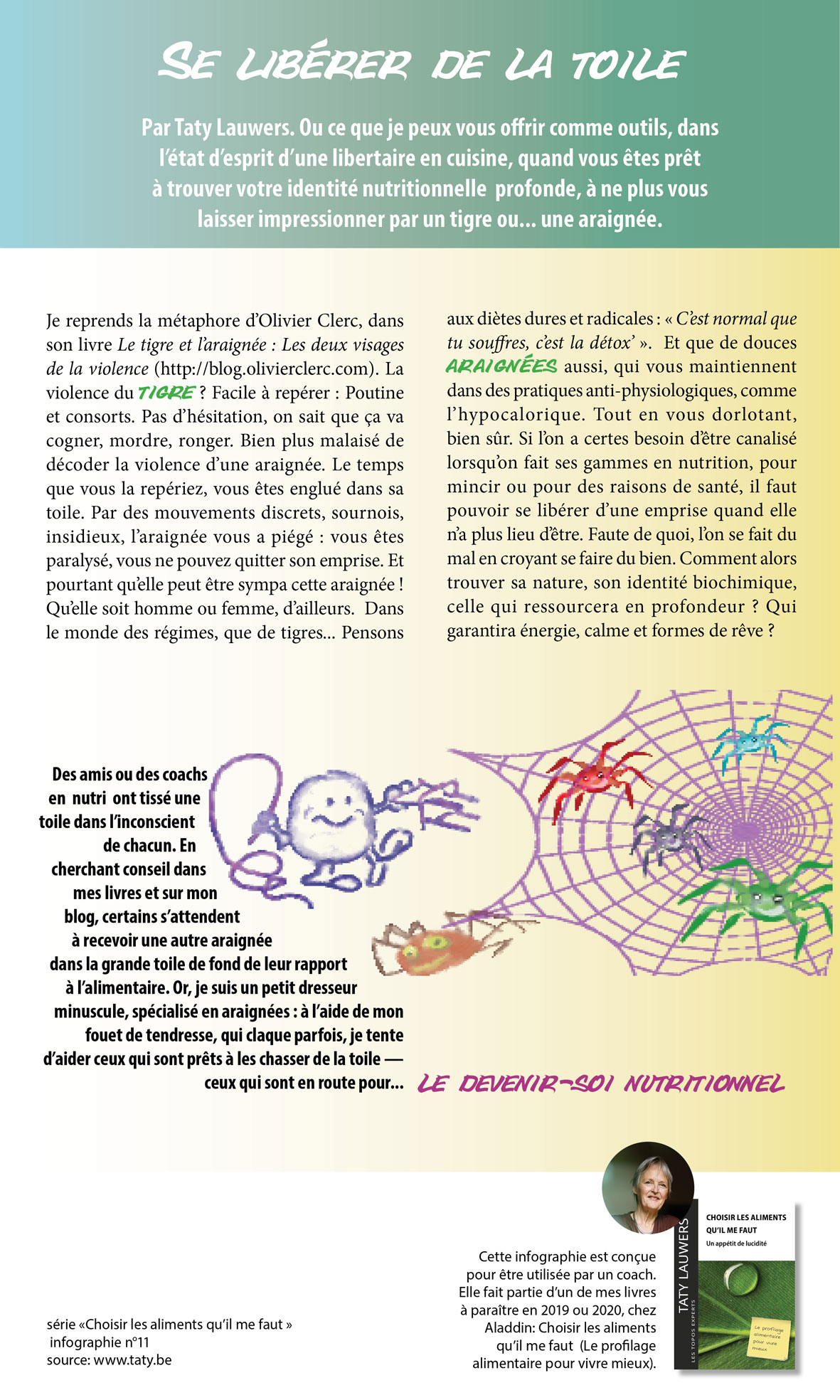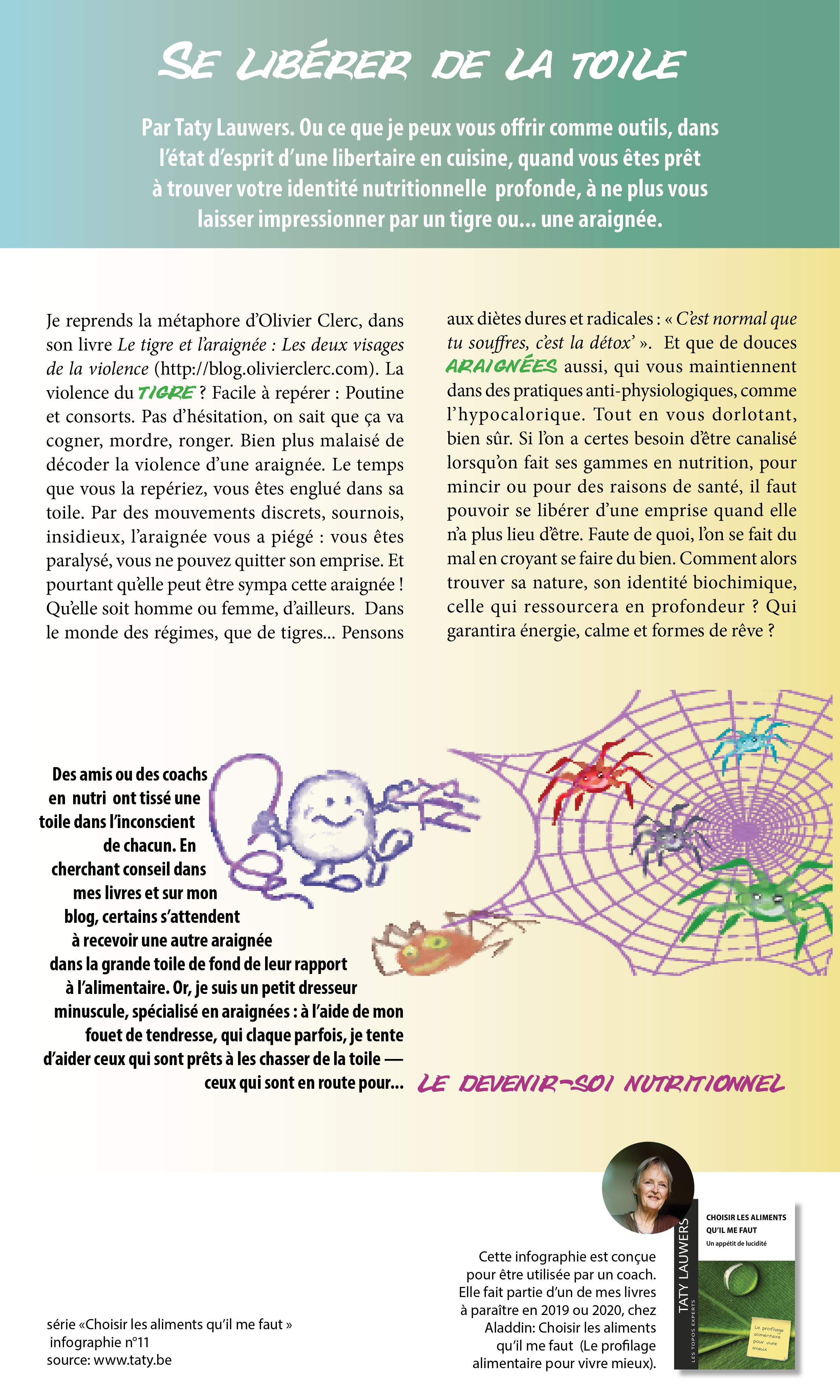Des amis ou des coachs en nutri ont tissé une toile dans l’inconscient de chacun. En cherchant conseil dans mes livres et sur mon blog, certains s’attendent à recevoir une autre araignée dans la grande toile de fond de leur rapport à l’alimentaire. Or, je suis un petit dresseur minuscule, spécialisé en araignées : à l’aide de mon fouet de tendresse, qui claque parfois, je tente d’aider ceux qui sont prêts à les chasser de la toile — ceux qui sont en route pour... le devenir-soi nutritionnel