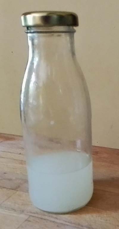 La deuxième solution, plus simple: laisser fondre un comprimé dans 100ml d'eau. Prélever un douzième par jour, à la seringue: 8ml. Voir photo. Une seule photo tant c'est simple. NB. Ultérieurement, j'ai marqué la hauteur de 100ml au marqueur indélébile pour ne plus devoir utiliser la balance