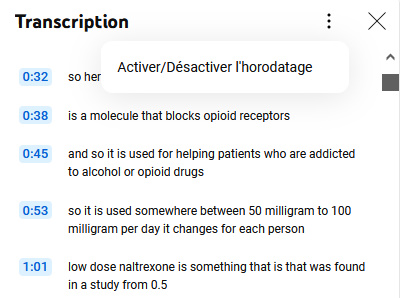 Comme il n'y a pas d'index dans les vidéos, je copie/colle souvent la transcription sans horodatage, en un long texte d'un seul long paragraphe. Cela me permet de rechercher ensuite sur mon disque dur selon contenu.