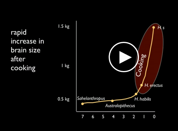 Grâce à la cuisson, ce qui était un gros handicap, cet énorme cerveau, dangereusement coûteux , avec beaucoup de neurones, a pu devenir un atout majeur à partir du moment où l'on a pu s'offrir assez d'énergie pour avoir beaucoup de neurones, et le temps de s'en servir à faire des choses intéressantes.Je pense donc que cela explique pourquoi le cerveau humain a évolué si vite pour devenir aussi gros,tout en restant un simple cerveau de primate. Avec ce gros cerveau que permet la cuisson des aliments,on est passé rapidement du cru à la culture, l'agriculture, la civilisation, le supermarché, l'électricité, le réfrigérateur, toutes ces choses qui aujourd'hui nous permettent d'avoir toute l'énergie nécessaire à une journée entière rien qu'en passant un petit moment dans notre fast-food préféré. Ce qui a d'abord été une solution est donc devenu un problème. L'ironie, c'est qu'on cherche la solution dans la nourriture crue.