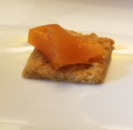 Gélatine : ne pas surdoser, les goûts du fruit disparaîtraient. On compte en général 8 feuilles par litre, j’ai ici un peu sous-dosé car mes préparations sont peu sucrées. Trop de gélatine : on ne goûterait plus rien.