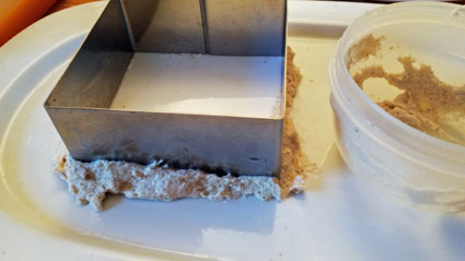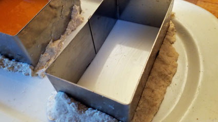 Petite difficulté lorsque j'ai gélifié dans des emporte-pièce (oui! toujours au singulier, tout bizarre que ça puisse paraître): les formes ne sont pas équilibrées sur le fond de l’assiette, comme on le voit sur la photo en fin d'article. Si je versais le coulis, il déborderait par le dessous. J’ai donc fait de la pâte à modeler minute en versant de l’eau sur de la farine. Je me farine le bout des doigts avant de modeler de fins boudins pour colmater les fuites.