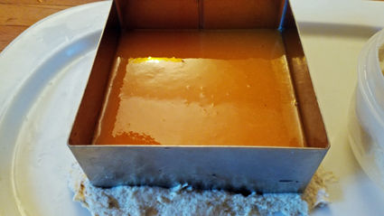 La forme. On peut verser le coulis gélifié sur une feuille de papier sulfurisé, en fine couche, puis découper des formes de languette. Il faudra alors trouver une solution pour les présenter, bien séparées (sinon ça colle!). J'ai donc opté pour une présentation en blocs bien nets - chacun pourra ainsi découper des languettes du coulis qui l’attire.