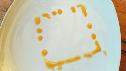 projet de présentation pour l'assiette qui recevra les carrés de coulis, que je comptais déposer décalés par rapport à ce fond. NB. Lors de la fête, j’ai oublié. Et voilà, et dieu dit que c’était bon.