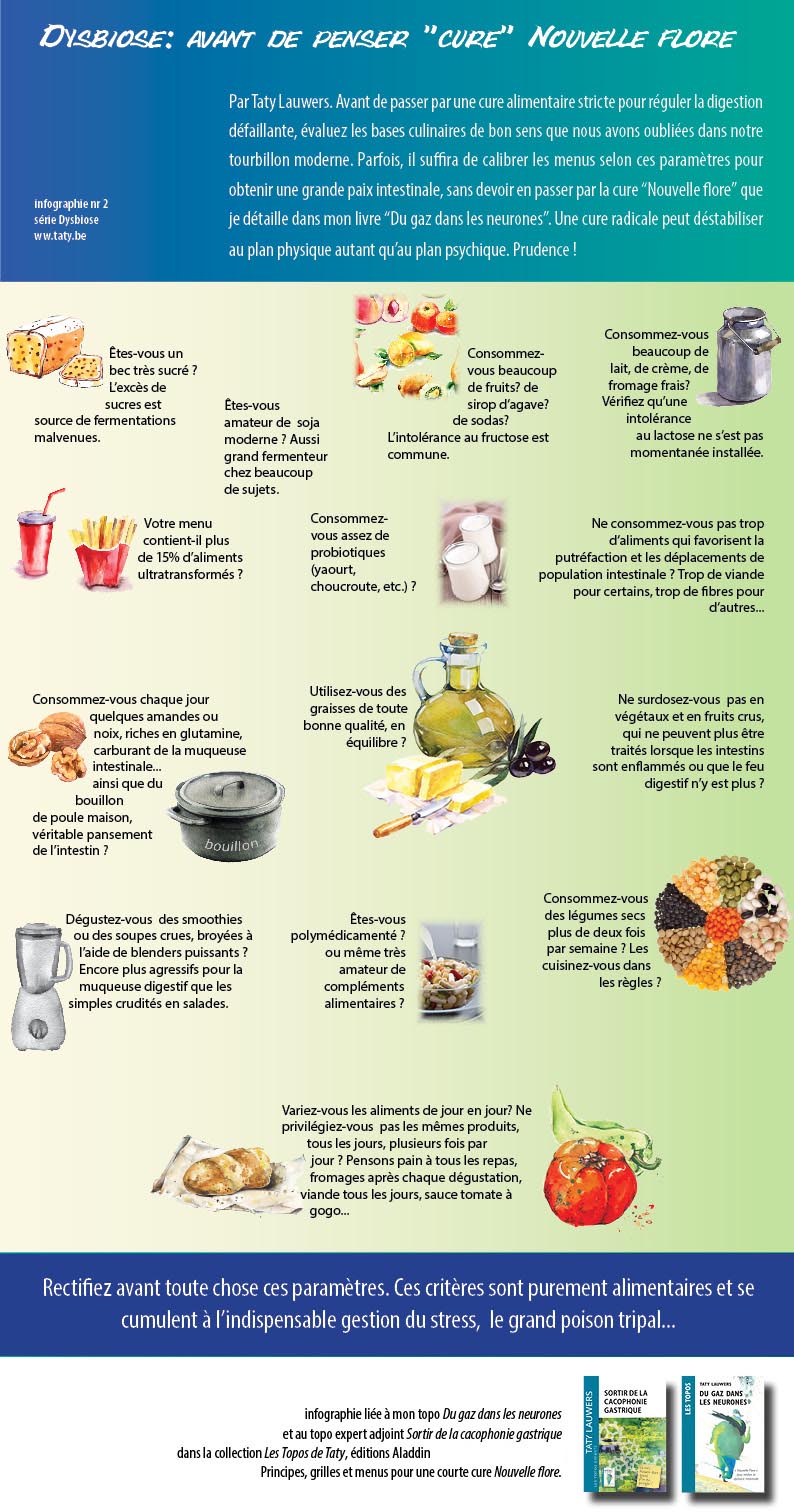 Avant de passer par une cure stricte pour réguler la digestion défaillante, évaluez les bases de bon sens que nous avons oubliées dans notre tourbillon moderne. Parfois, il suffira de calibrer les menus selon ces paramètres pour obtenir une grande paix intestinale, sans devoir en passer par la cure “Nouvelle flore” que je détaille dans mon livre “Du gaz dans les neurones”. Une cure radicale peut déstabiliser au plan physique autant qu’au plan psychique. Prudence !