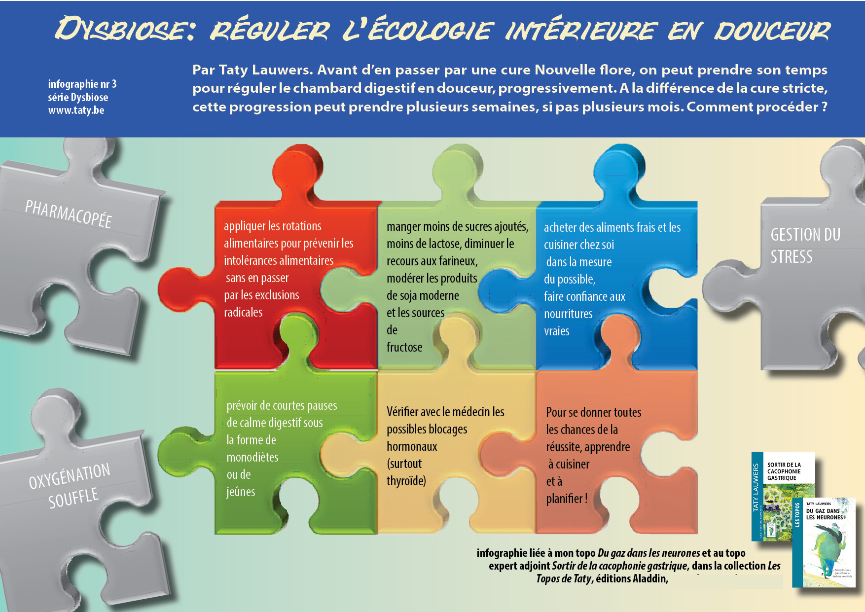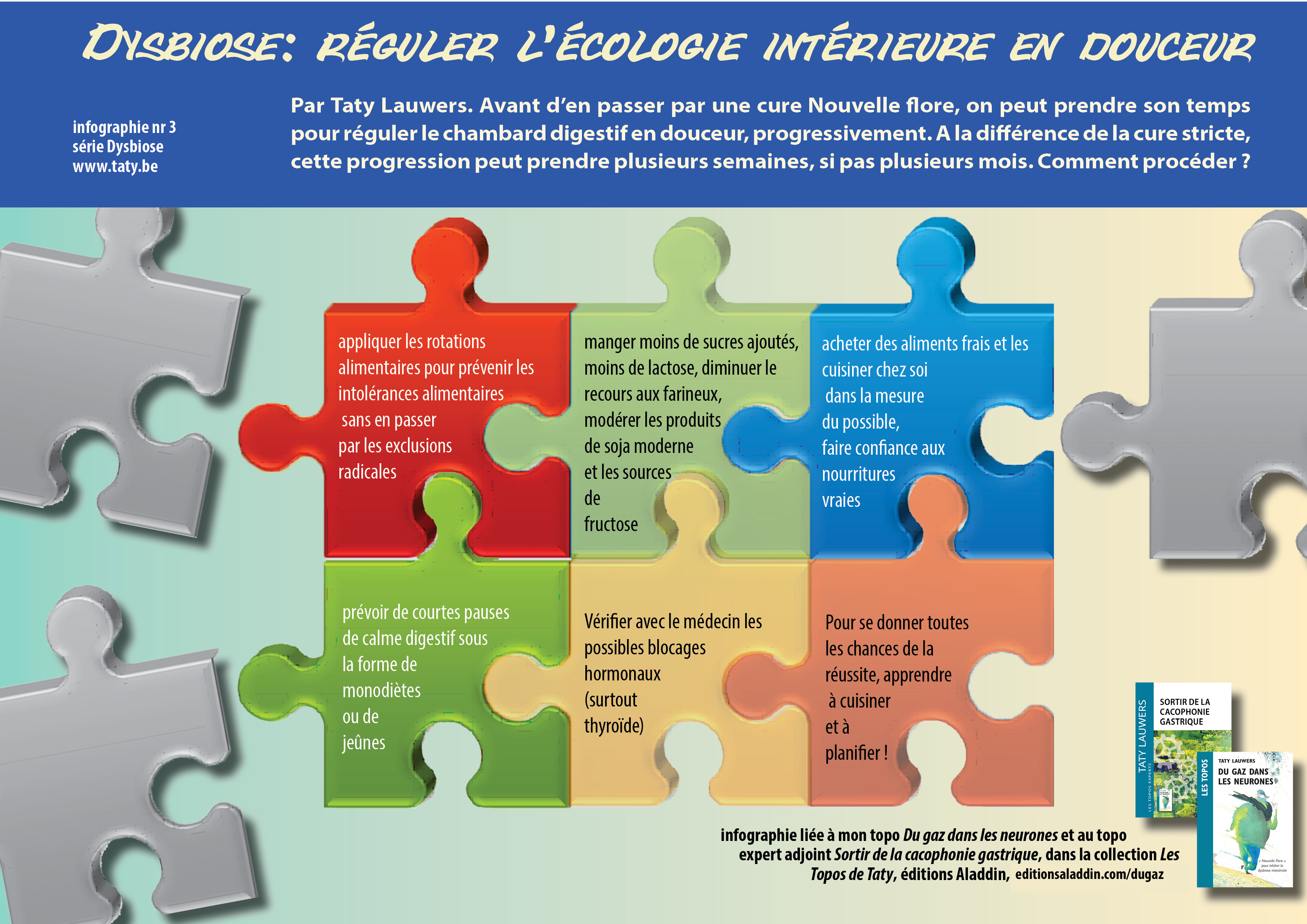 <a href="https://www.taty.be/dugaz/DG3regulerdouceurinfogr.html">"Dysbiose: réguler l’écologie intérieure en douceur, par Taty Lauwers - www.taty.be</a>.</p>