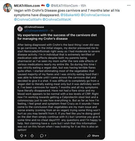 Je lis sur tw: "Un végane victime de la maladie de Crohn devient carnivore et 7 mois plus tard tous ses symptômes ont disparu".