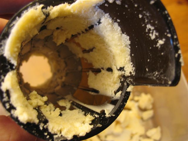 Il est capital de ne pas utiliser d'embout, quel qu'il soit; la pression serait trop forte. C'est surtout le cas avec le prochain modèle Jazz Max, qui sort en septembre (vis noire et embout gradué). Partant d'un bloc de parmesan reggiano,