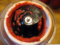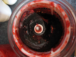 Atout majeur du Jazz Pro par rapport à Max: l'orifice étant plus grand, j'ai taillé les Roma en deux seulement ; ce que j'ai pu faire pendant l'extraction, puisque je n'ai pas besoin d'accompagner les légumes comme avec le Max. J'ai passé de l'ail pelé pour accompagner ma sauce tomates à base du coulis ci-dessus.
