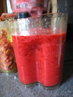 Je les ai produits en 3 minutes environ (à reminuter précisément en saison, juin prochain 2008). Il a fallu laisser l'appareil tourner trois minutes supplémentaires pour que toute la pulpe soit éjectée, minutage que je ne compte pas puisque je ne dois pas rester présente.