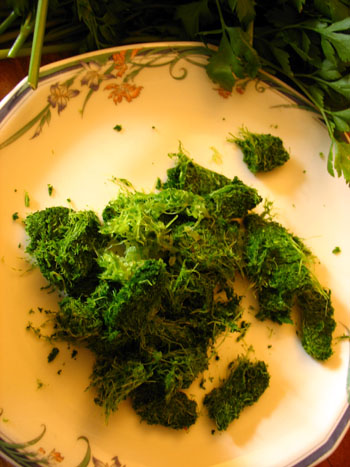J'ai fait le test avec du persil plat frais (car je dééééteste le goût du jus d'herbe de blé), mais le résultat serait pareil.