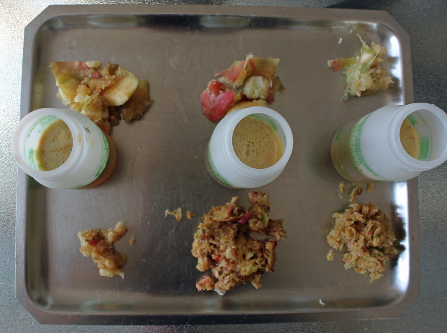 Comm. photo. En bas d'écran ce qui est éjecté, en haut d'écran ce qui est resté dans le mécanisme. Je série sur toutes mes photos comparatives les "pulpes" dehors/dedans car ce qui reste dans le mécanisme sera broyé si on fait suivre par d'autres végétaux.