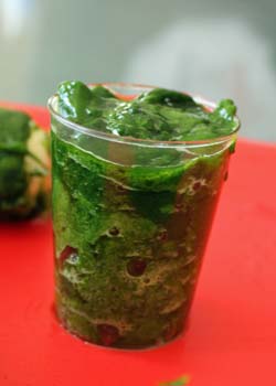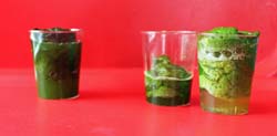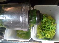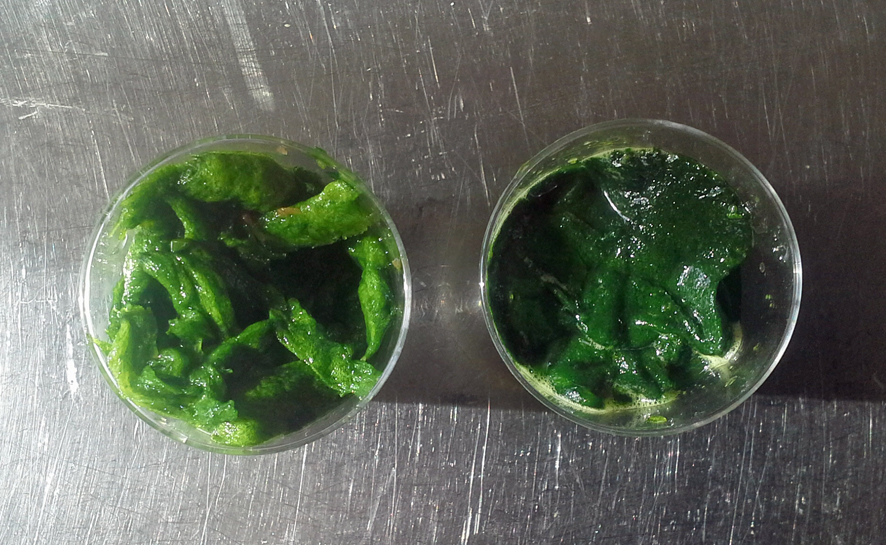 Je teste au filtre moyen le vert d'un gros poireau + la même chose en Jazz Max. +- 130g de poireau me donnera environ 40g de jus/gel. Les quantités sont ici inutiles, car en réalité je viens d'extraire tous les principes actifs, ce que tous les organismes ne savent/peuvent pas faire. Même si je n'avais récupéré que 20g, je trouverais la manoeuvre utile à cause de cet effet de prédigestion.