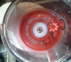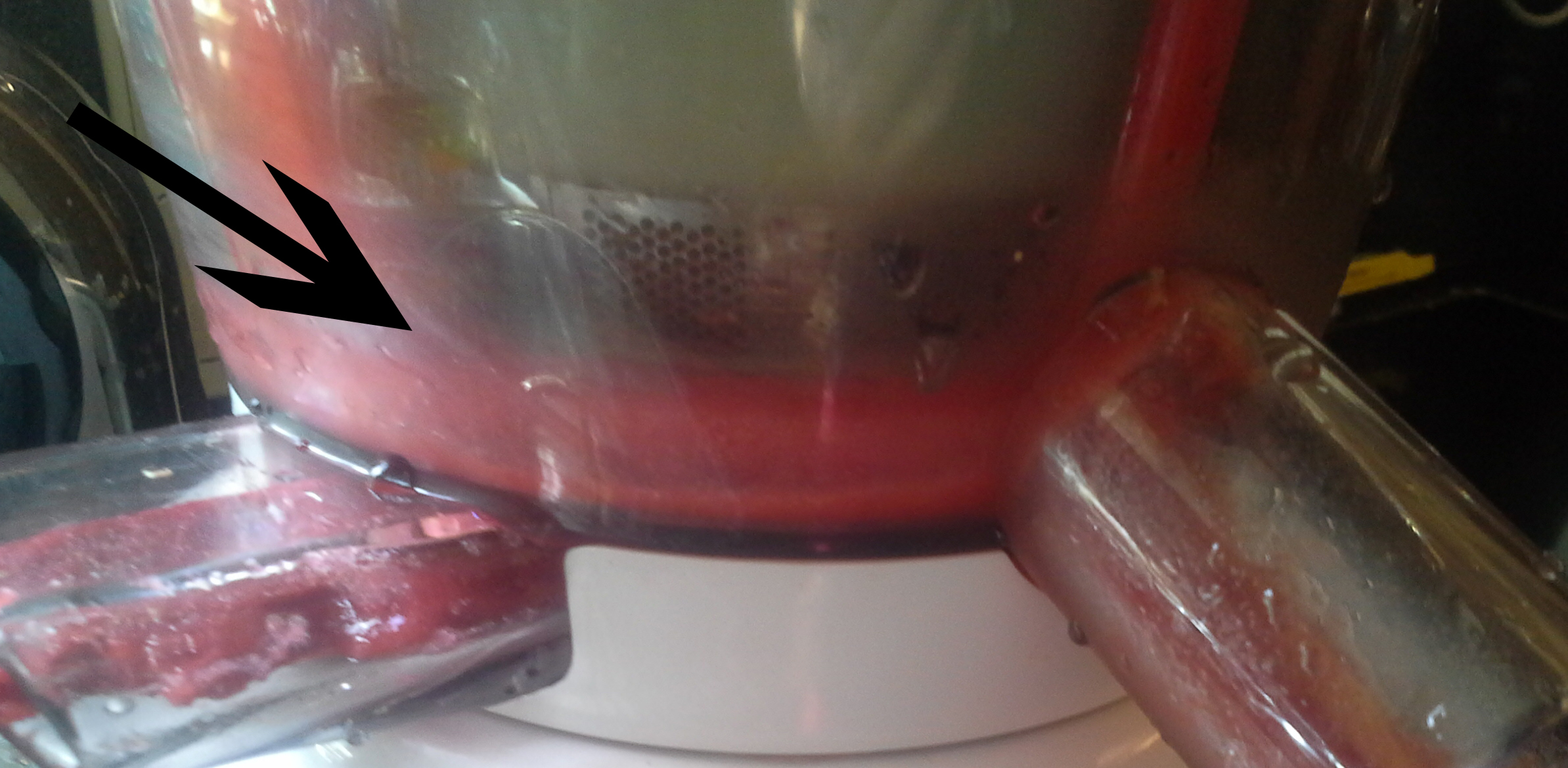 Jazz Max: testé le même produit, avec l'embout gradué sur 5. Ici, on ne peut PAS tout verser d'un coup, l'appareil traînerait (sans bloquer nécessairement). La règle : il ne faut lui donner à mâcher qu'à la vitesse de ce qu'il peut produire (voir mode d'emploi, où c'est bien précisé). Je le connais assez pour savoir que j'introduirai deux à trois fraises à la fois. Je dois malgré tout m'aider du côté « pression » du pilon. Sur ce coup, je ne peux pas faire une vaisselle pendant que je presse les jus..