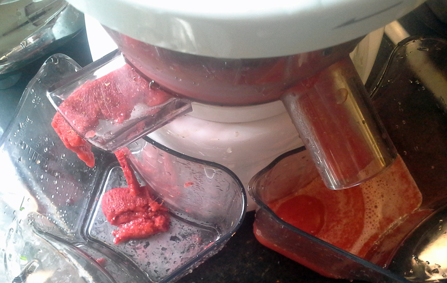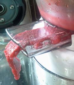J'ai décongelé une heure des fraises entières, congelées en juin de l'année passée. Elles sont encore à moitié dures de gel. Vertical: je verse les 500 grammes d'un coup. L'extraction est très rapide, la pulpe est assez sèche. Je passe une deuxième fois et je laisse tourner 2 minutes pour éjecter le maximum de déchets: je ne récupère que 10% de jus.
