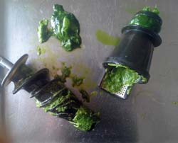 Comm. photo. Gauche: un peu de jus reste sur le filtre du Jazz Max, je récupère aussi au doigt; pulpe très sèche; droite: ce qui reste dans le mécanisme du Jazz.