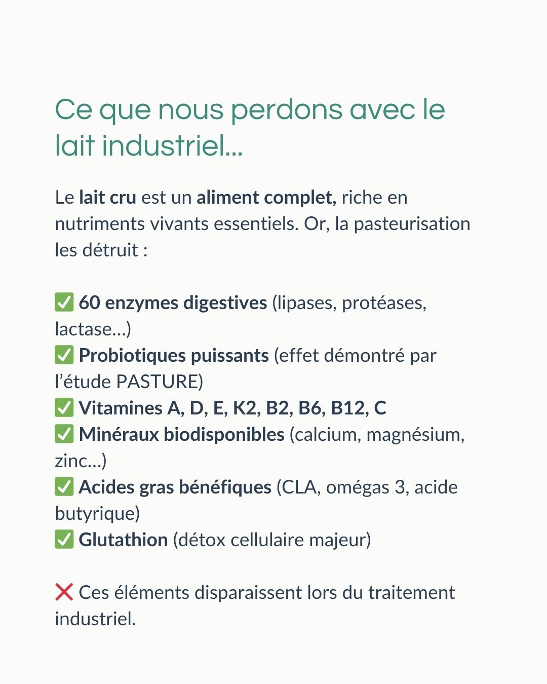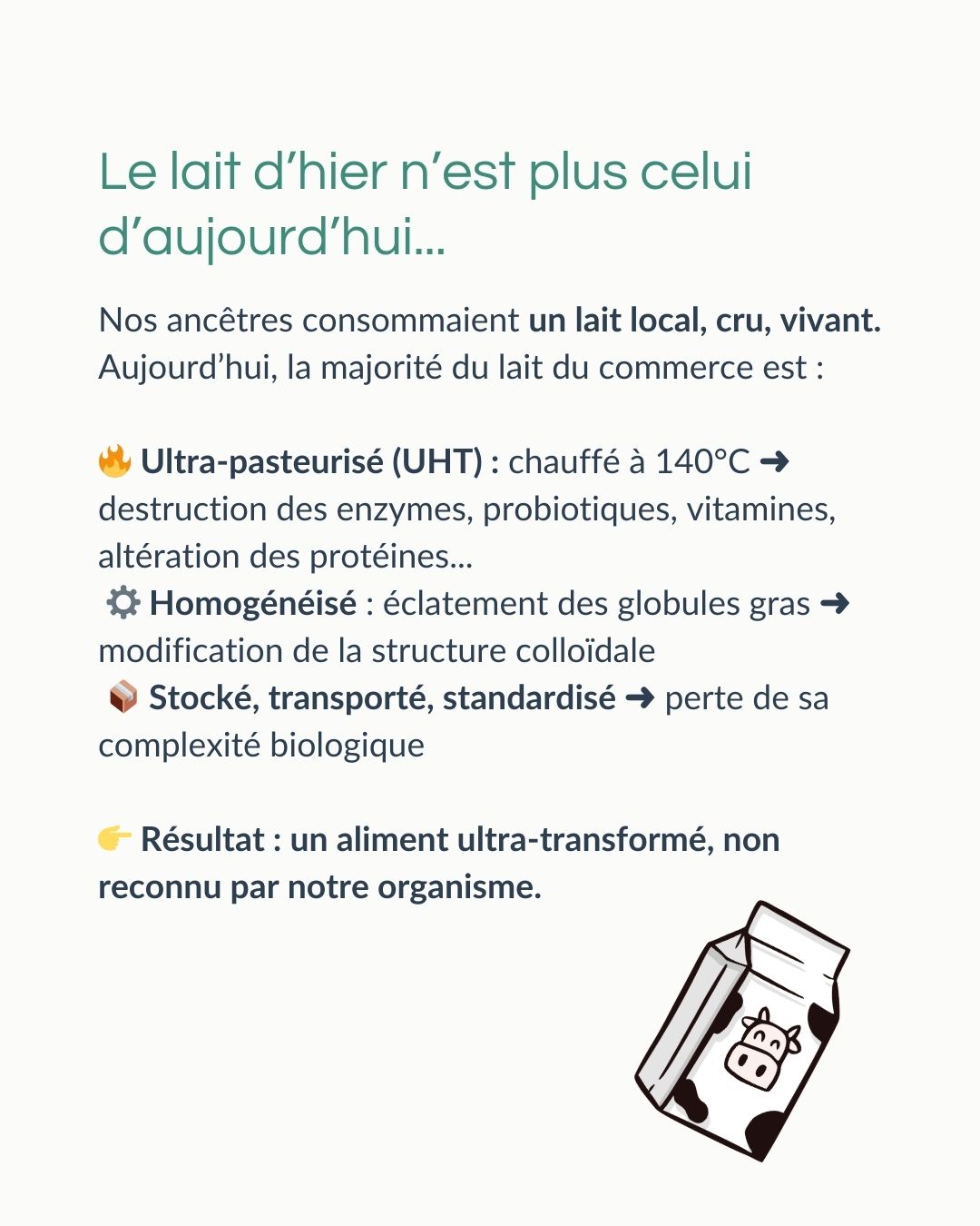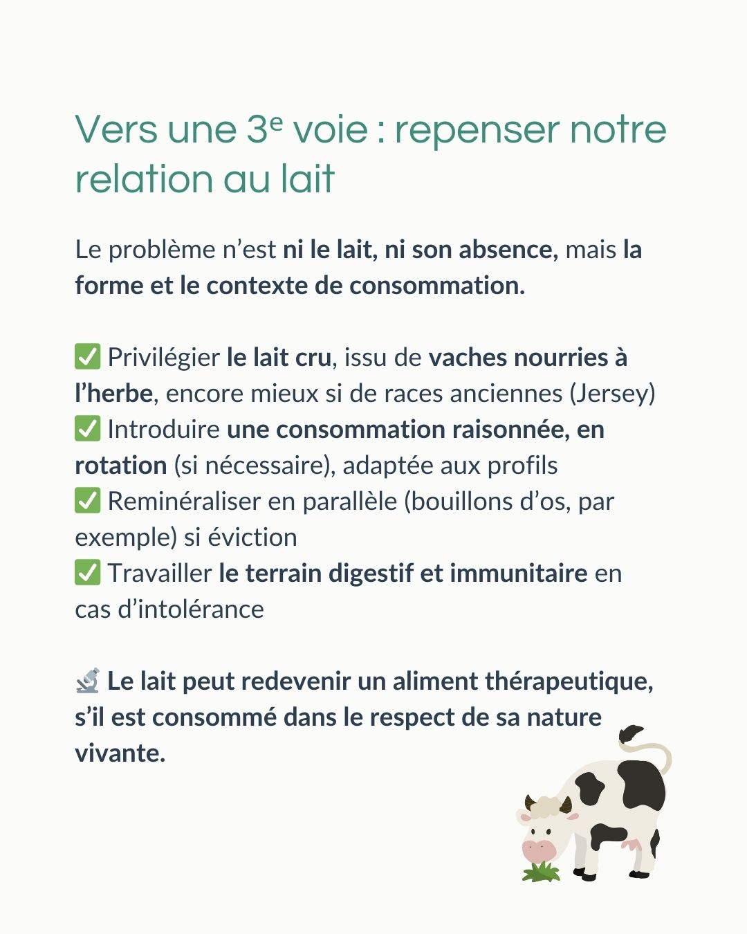 En Profilage alimentaire, nous n’excluons aucun aliment (ou groupe d’aliments) à long terme, sauf en cas d’allergie franche bien évidemment. Cependant nous veillons à ce que ceux-ci soient pris sous leur forme ressourçante. Pour les laitages, cela signifie qu’ils doivent être le plus possible à base de lait cru. Les substituts industriels à base de soja ou autres substituts pasteurisés UHT ne sont pas considérés comme des aliments ressourçants.
