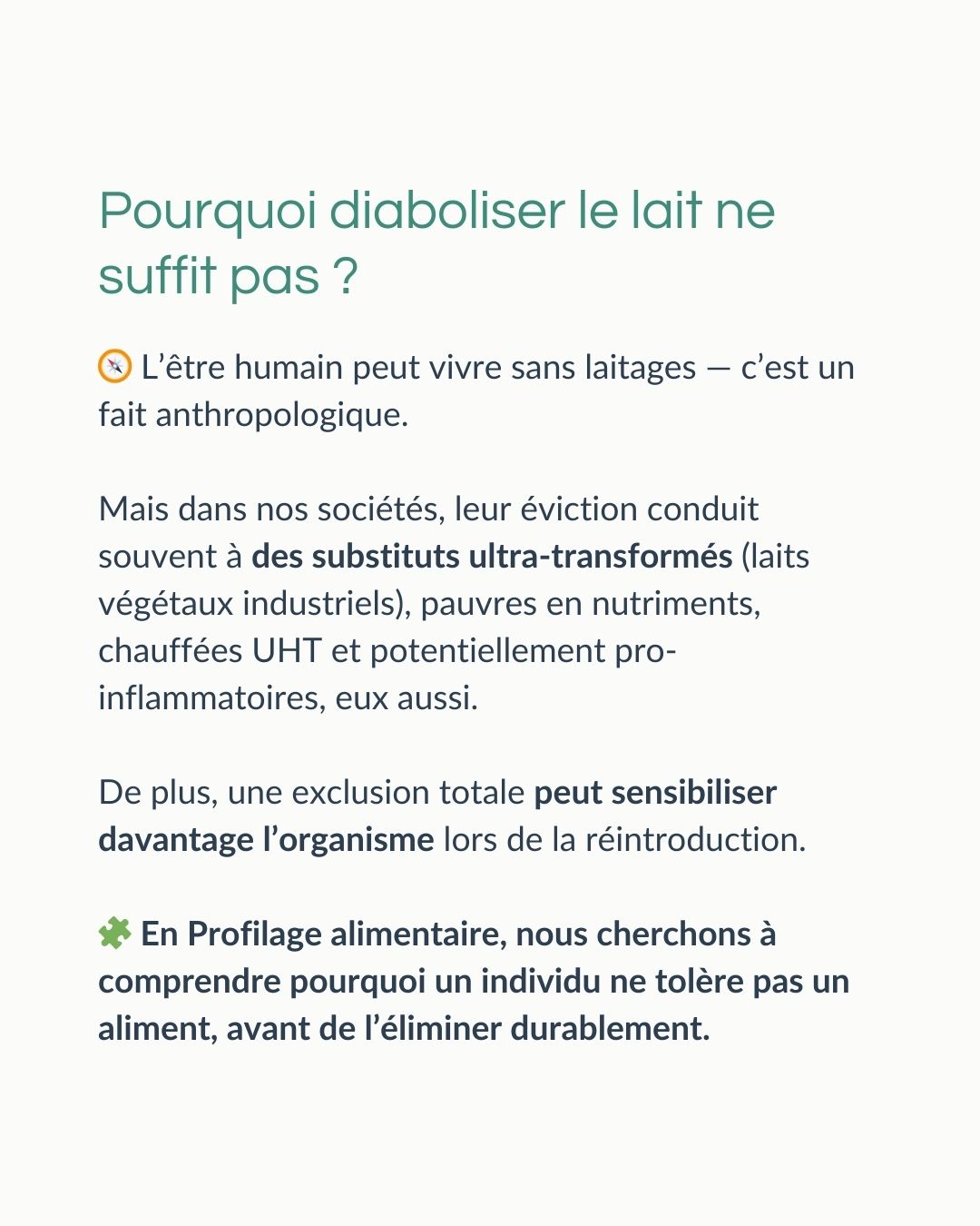 Pour d’autres personnes, la sensibilité aux laitages est passagère et est la conséquence d’une pathologie ou un déséquilibre organique. Ces déséquilibres temporaires de l’organisme qui pourront être identifiés par un référent en Profilage alimentaire grâce aux questionnaires qu’il a à sa disposition.