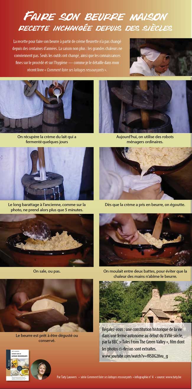 La recette pour faire son beurre à partir de crème fleurette n’a pas changé depuis des centaines d’années. La saison non plus : les grandes chaleurs ne conviennent pas. Seuls les outils ont changé, ainsi que les connaissances fines sur le procédé et sur l’hygiène — comme je le détaille dans mon récent livre. En images qui bougent, lors d'une reconstitution historique produite par la BBC. Cliquez sur l'image pour découvrir le film dont j'ai extrait les images.