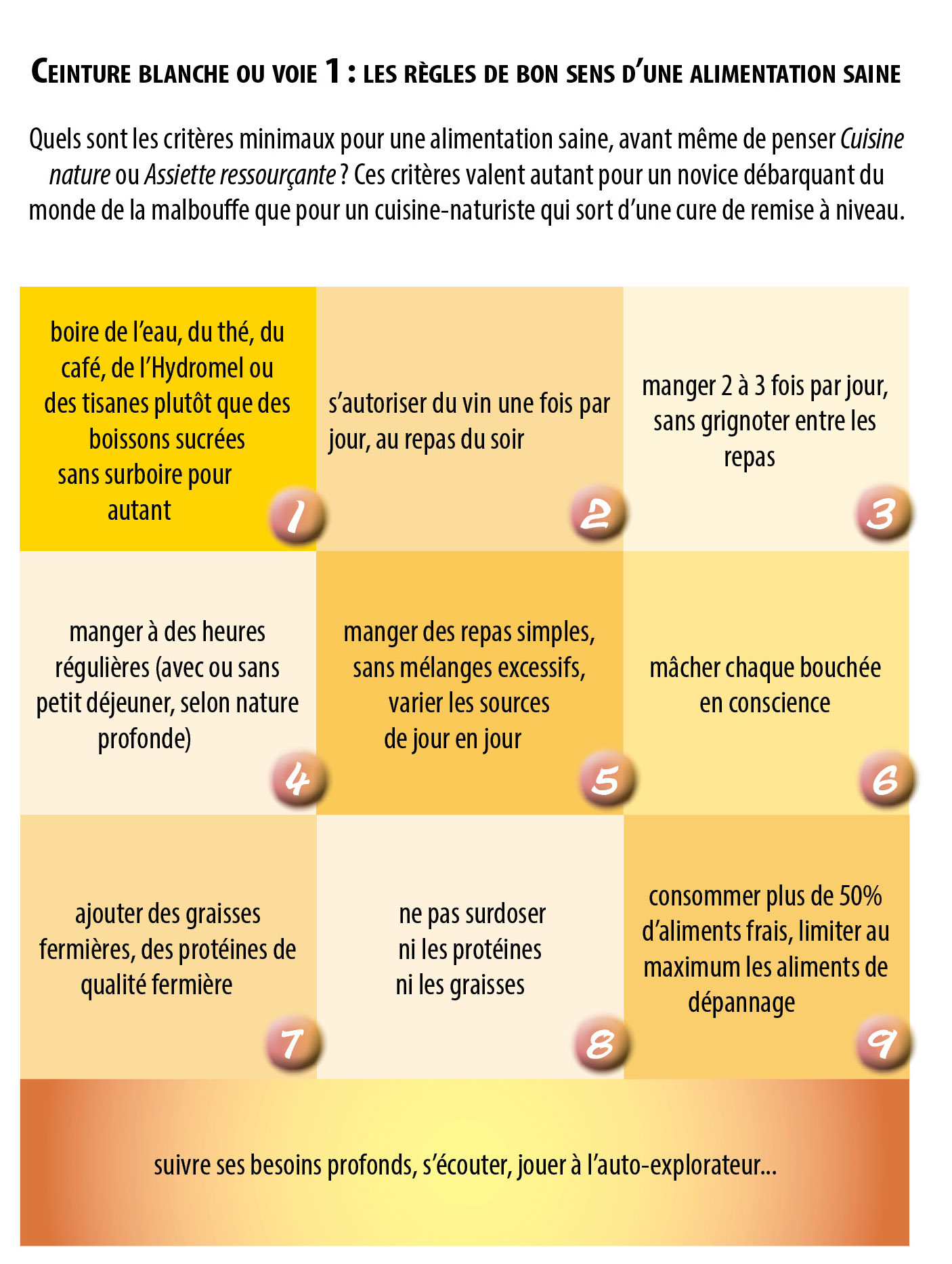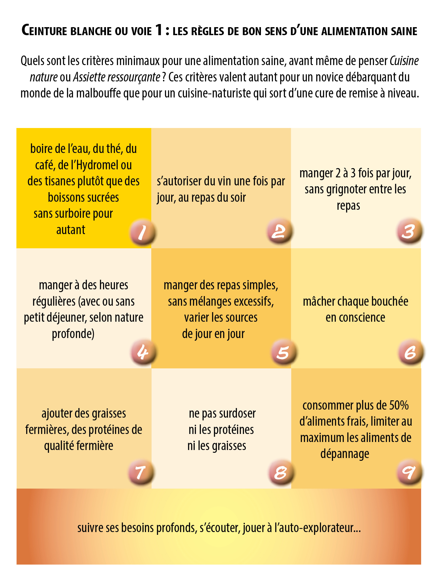 Néophyte, commencez par intégrer au moins les douze critères de bon sens alimentaire — la ceinture blanche, sur le mode des grades en judo ( illu sur la p. 99 de la 4è édition, voir ci-dessous).