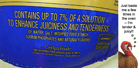 On sait qu'il est autorisé aux States de baigner la volaille dans l'eau de javel pour la nettoyer de toute salmonelle. Pour la rendre plus juteuse et fondante, on peut aussi injecter la chair avec de l'eau et des arômes ainsi que des amidons modifiés – et du phosphate de sodium pour faire bonne figure. Heureusement, ce type de pratique est indiqué sur l'emballage.