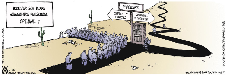 6.3 Simple mais faux (mes ajouts sur un cartoon de Wiley Miller). Cliquer pour agrandir. Je révise pour l'instant la prochaine édition de "Nourritures vraies". On me parle de la prochaine conférence d'Irène Grosjean, d'une vidéo de Casasnovas. Je réponds ce que je rétorque après les apparitions de Marine Lepen: "ils posent les bonnes questions, ils donnent les mauvaises réponses" (dixit Laurent Fabius). Désormais je pourrai répondre par une image, encore plus court, chouette... J'aime beaucoup le précipice à gauche.